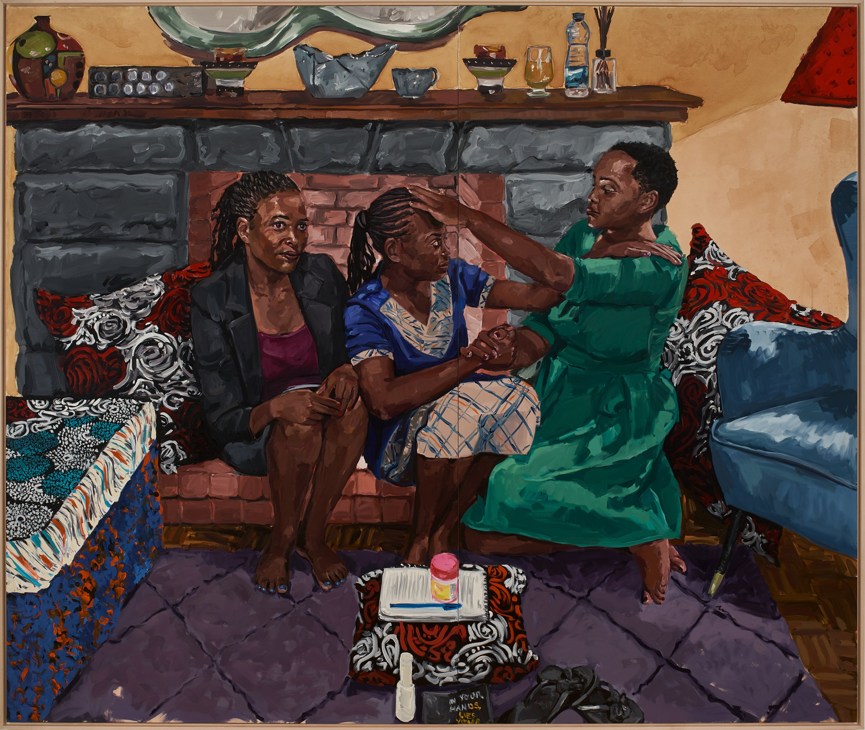 Kemunto, Mary and Sarah, 2023Oil on tea-stained canvas, in two parts (framed)97 x 115 in ( 247 x 293 cm)ShareShare